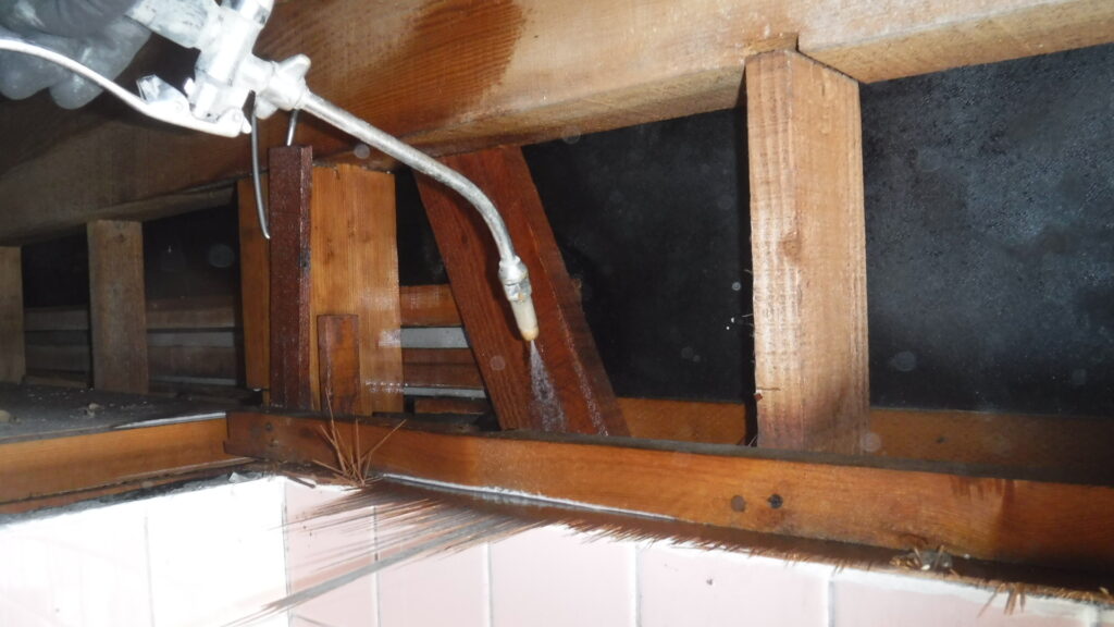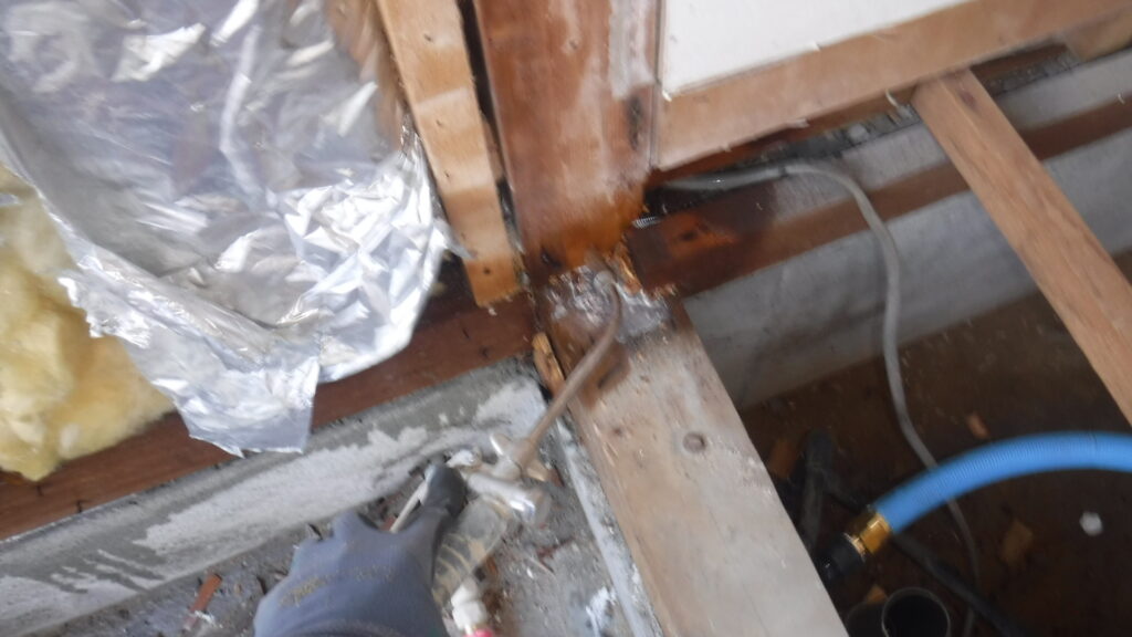 洗面脱衣室の点検口から床下に潜入し、ほふく前進で進みながら以下の点検・修復を行いました。