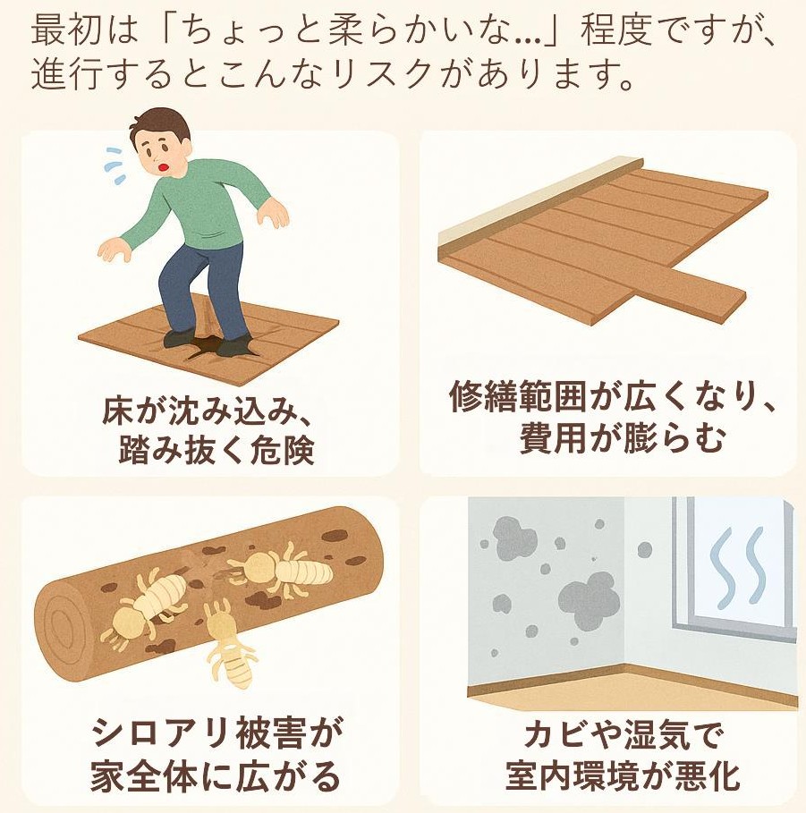 初期段階では気づきにくく、「あれ?床がゆるい?」という違和感で発覚することも。