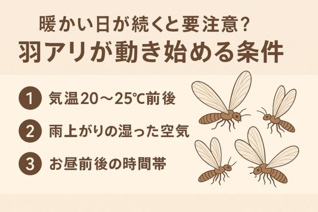 実は羽アリには動き出す“条件”があり、その条件がそろうと一斉に姿を見せるようになります。
